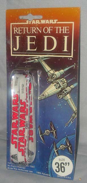 1983 36in Darth Vader: Red SW logo & Vader head shoelaces. These carded shoelaces supplemented Stride Rite's shoe line, which replaced Clark's as the licensee for shoes in the United States. My pair is not Package.